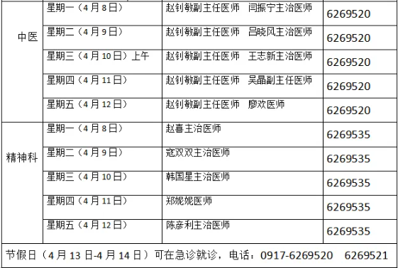 为了更好的满足患者就诊需求,方便服务患者,我院特推出4月8日--4月12日门诊一览表,您可根据需要自行选择就诊时间及预约挂号方式。