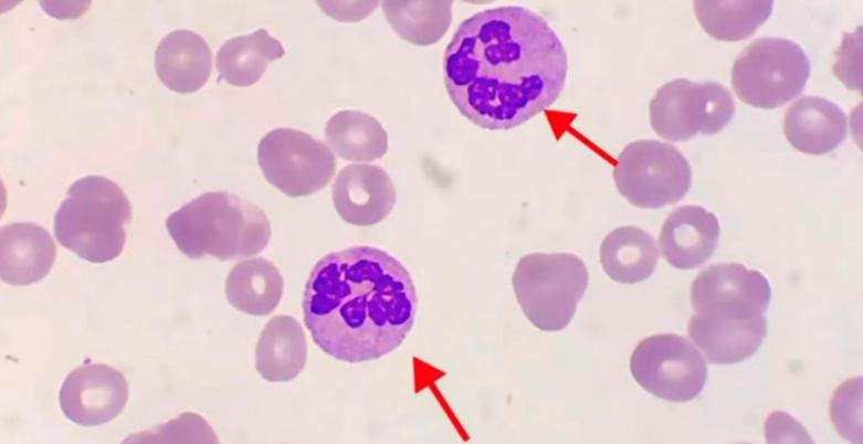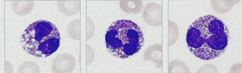 (图4多分叶核中性粒细胞) 主要见于:巨幼细胞性贫血、骨髓增生异常综合征、化疗后。 特别指出在炎症恢复期可出现一过性核右移现象。但是在疾病进展期突然出现此现象可提示预后不良。 总结一下,中性粒细胞的核象变化是血常规检查中一个低成本、高价值的动态监测指标。实验室通过借助血涂片仔细观察并准确报告核象变化,能为临床医生提供超越单纯白细胞计数的深层信息,对于早期识别严重感染、鉴别诊断感染类型和贫血原因、评估病情严重程度和机体反应能力、判断预后和疗效观察,具有不可替代的重要作用。