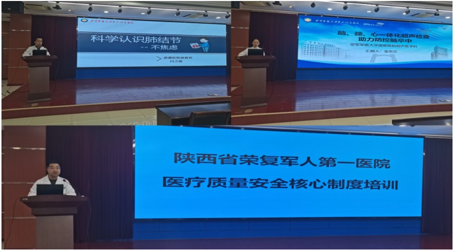 培训会上,唐都医院放射诊断科闫卫强主治医师以《科学认识肺结节--不焦虑》为主题进行授课。他结合自身多年临床工作经验从肺结节的定义、测量标准、常见病因、诊断方法、处理原则等方面进行详细讲解,将工作中遇到的典型病例与大家分享。唐都医院超声医学科金京兰主治医师以《脑、颈、心一体化超声检查助力防控脑卒中》为主题进行授课,她结合影像视频,生动形象地从脑卒中的分类与病因、使用人群、各部位检查内容及意义、脑颈心一体化超声的临床价值、典型案例等方面进行讲解。两位专家扎实的理论功底和丰富的临床经验使全院业务人员对相关知识有了更深的理解,对进一步提升我院临床诊断水平具有重要意义。最后,医务科主任冯卫涛立足我院实际,结合医院日常医疗质量管理中可能存在的薄弱环节,系统全面地对全院业务人员进行《医疗质量安全核心制度要点与实践》培训。他强调,医疗质量安全核心制度是保障医疗安全的“生命线”,各业务人员要结合岗位职责,进一步深刻理解医疗核心制度内涵,严格落实执行,将制度要求融入到日常诊疗工作的每一个环节。