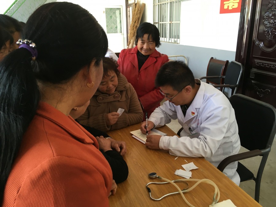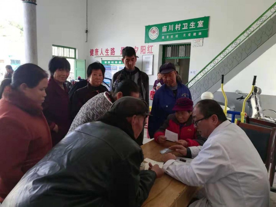 胥院长带领7名业务骨干为庙川村近100多名村民进行了量血压、测心电图、B超检查、中西医问诊、向村民普及健康知识等服务活动,还为贫困户发放5000元的日常备用药品。