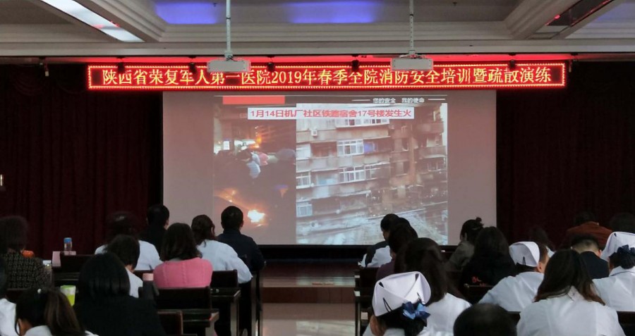三月二十八日下午,陕西省荣复军人第一医院召开2019年全院春季消防安全培训会议暨消防安全应急疏散演练,全院在职在岗人员(包括各类临聘人员)参加了培训和演练,院党政领导全部出席。