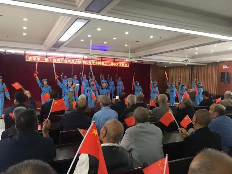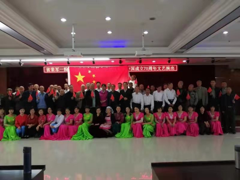 9月18日下午,窗外细雨蒙蒙,屋内欢声笑语不断,掌声阵阵!宝鸡市金凤凰合唱团一行37人来院与在院疗养的103名退役军人、院领导、部分工作人员共同进行了一场文艺演出活动。 一首《我家在中国》为演出拉开序幕,李刚副院长发表致辞,对合唱团4年来坚持来院义务演出表示感谢。此次节目丰富多彩,退役军人情绪高涨,跟随节目不时地发出喝彩声、掌声。演出在合唱《歌唱祖国》中落下帷幕,在场全体人员手挥小国旗,共同为伟大祖国70周年华诞送出美好祝福。 演出结束,院领导、退役军人代表与全体演职人员共同合影留念。