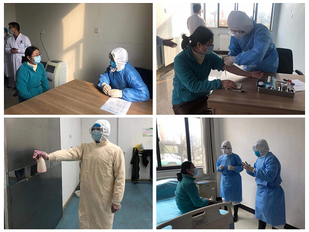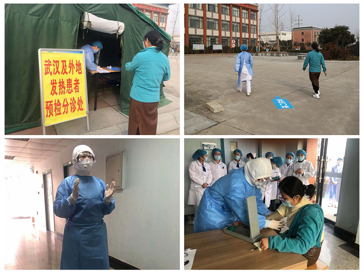演练以模拟实战的方式进行。门诊预检分诊处护士对发热患者进行体温测量、登记发热患者信息,确认患者发热(模拟假设),护士立刻引导患者前往发热门诊就诊。经过发热门诊医生初步问诊和查体、对患者进行抽血化验、CT检查等一系列检查,拟诊为新型冠状病毒感染的肺炎疑似病例,后立即上报防控领导小组办公室。